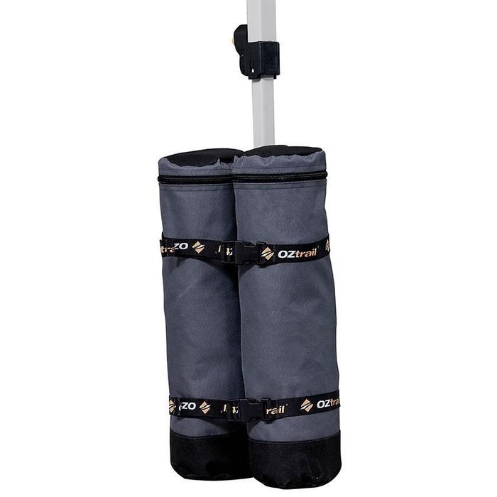 Simply fill the back with sand and attach to your gazebo leg with Velcro straps.