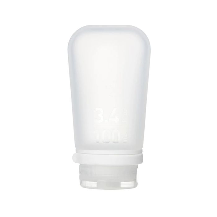 Made from a soft yet rugged silicone, the GoToob+ has a large opening making it easier to fill and clean. The bases are contoured so that they can stand up easily for filling.A lockable collar makes it almost impossible to accidentally open the cap, reducing the chance of leakage, and provides a handy loop to hang the tube from a hook or clip it to the outside of a pack. There's also a textured area on the collar to write in the contents with a permanent marker. The small 100ml size slips easily into pockets, bags, purses, and other tight spots.