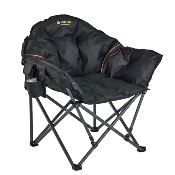 The Roamer Moon Chair features a cosy, padded moon shape with a 22mm steel frame and lumbar support, providing comfort for long outdoor sessions.