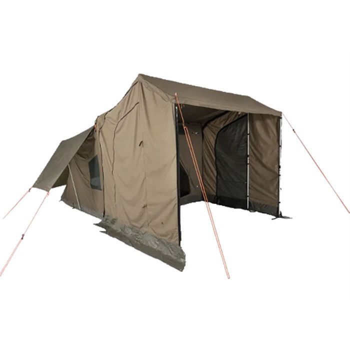 They simply and easily zip to the awning and side of the tent. They are made from the same waterproof Ripstop Polycotton Canvas as the tent. The Peaked Side Panels also have a zippered canvas door and a zippered superfine mesh screen door in each side.